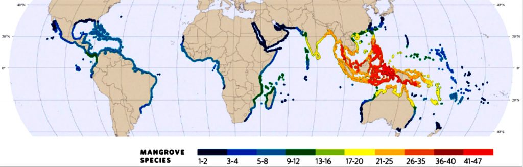“As florestas de mangue estabilizam a costa, reduzindo a erosão causada por tempestades, correntes, ondas e marés. O intrincado sistema radicular dos manguezais também torna essas florestas atraentes para peixes e outros organismos que procuram comida e abrigo de predadores.”