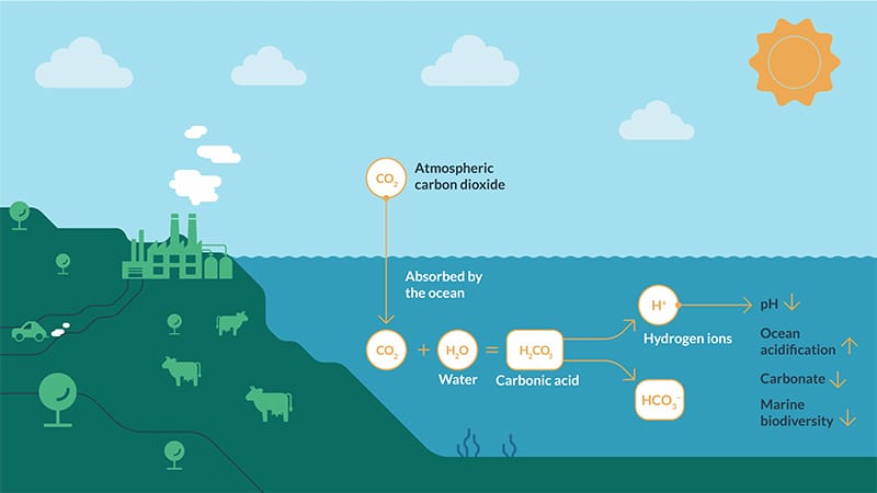 A queda do pH reduz a disponibilidade de íons carbonato, substância essencial para organismos como corais, moluscos e parte do plâncton formarem conchas e esqueletos calcários. Com a acidificação dos oceanos, ou seja, com menos carbonato disponível, esses organismos têm mais dificuldade para crescer, se reproduzir e sobreviver.
