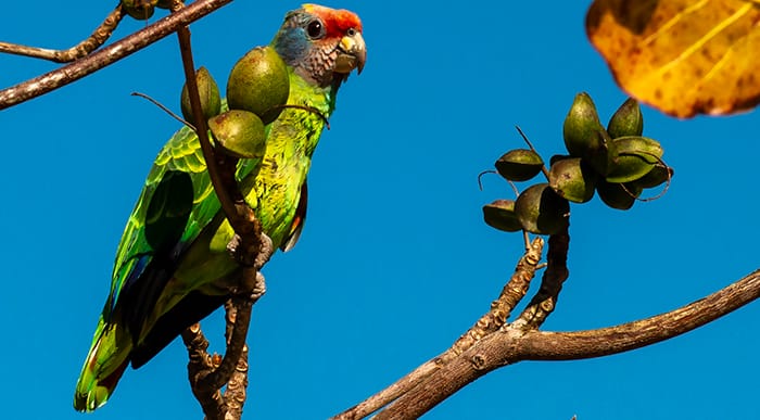 O belíssimo Amazona brasiliensis, ou papagaio de cara roxa.