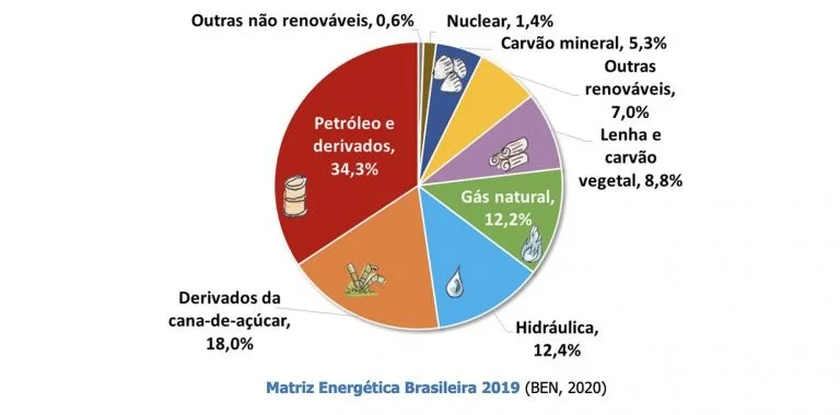 Agora a brasileira…”A matriz energética do Brasil é muito diferente da mundial. Por aqui, apesar do consumo de energia de fontes não renováveis ser maior do que o de renováveis, usamos mais fontes renováveis que no resto do mundo. Somando lenha e carvão vegetal, hidráulica, derivados de cana e outras renováveis, nossas renováveis totalizam 46,2%, quase metade da nossa matriz energética.”