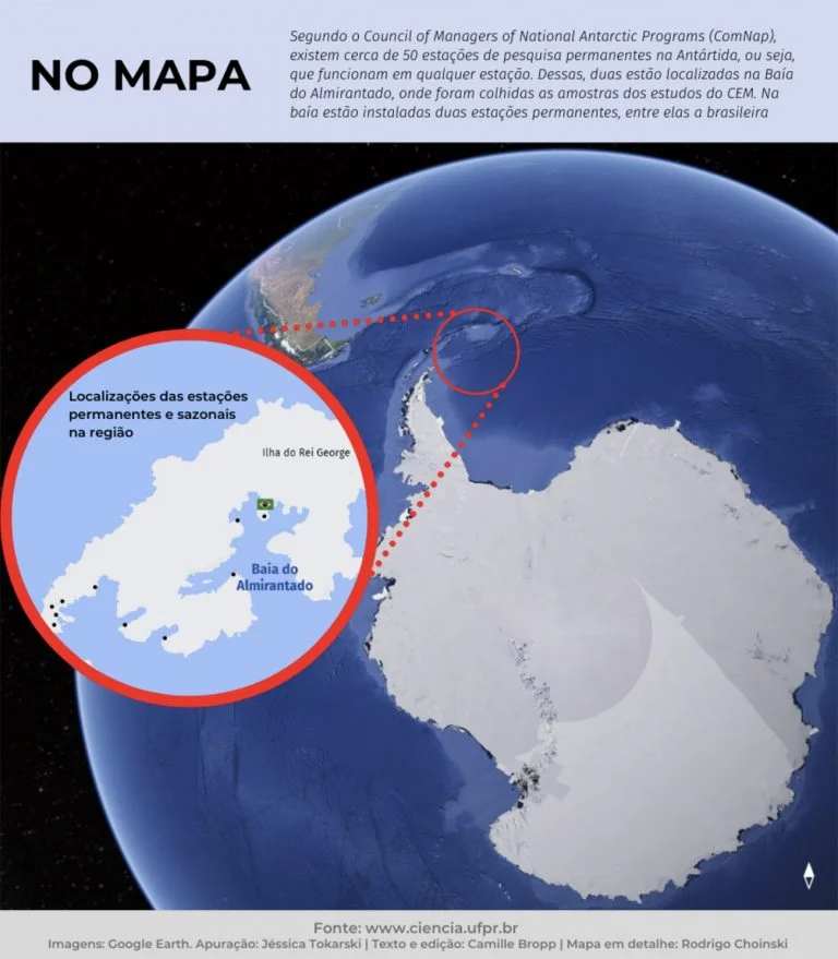 Cientistas do Centro de Estudos do Mar da UFPR, Universidade Federal do Paraná, revelam o impacto da atividade humana na região da Baía do Almirantado (onde o Brasil e mais alguns países têm suas bases), uma das mais movimentadas do continente antártico.