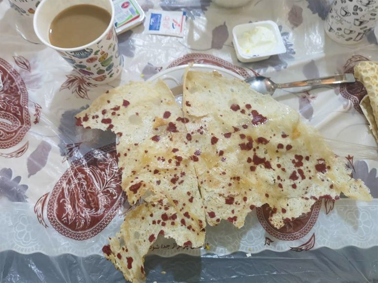 “A terra vermelha é usada como molho”, explicou Maryam Peykani. “Chamam esse molho de soorakh. Ele é espalhado sobre o pão achatado pouco antes de sair do forno.”