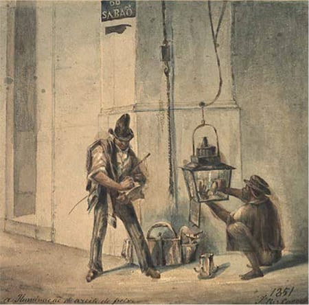 José dos Reis Carvalho. A iluminação do óleo de peixe. 1851. Aquarela. A obra retrata a iluminação no Rio de Janeiro. (Fonte: LUCCHESI, 2015, p. 1. 47.)