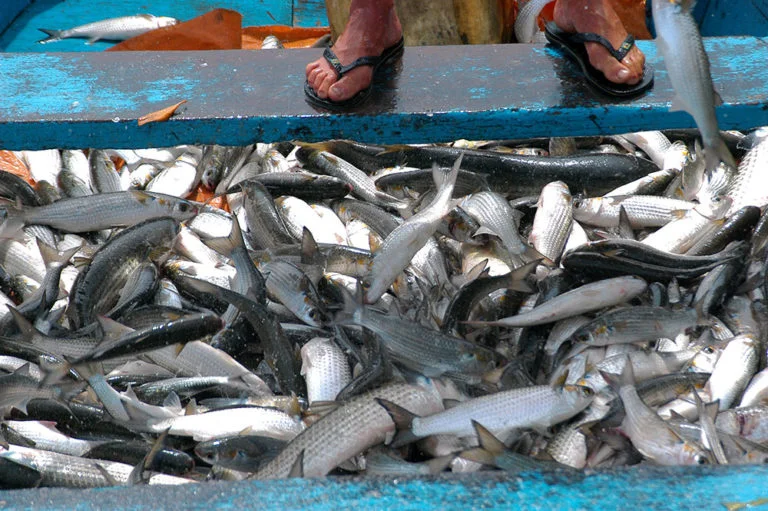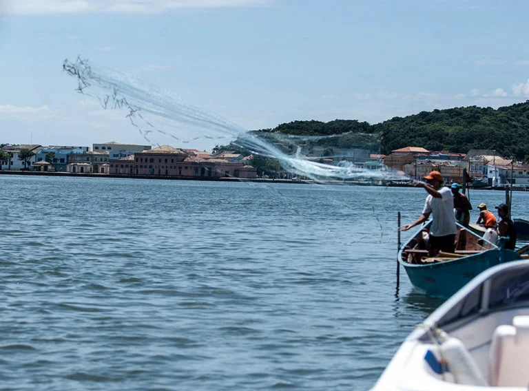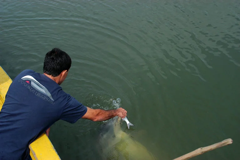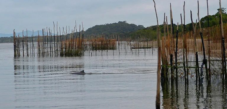 O golfinho logo começava a empurrar os peixes para o cerco. Em seguida, o pescador e seu ajudante tiravam os peixes do cerco.