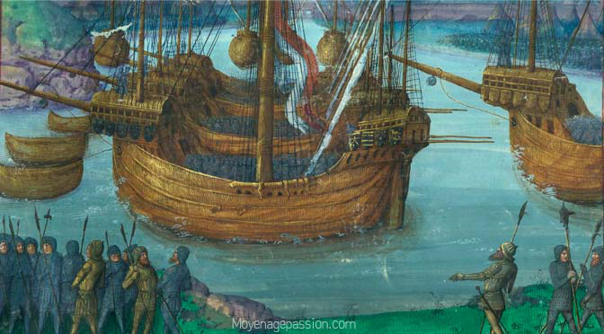 Ilustração do final do século XV tomando um tema da história antiga (Expedição de César para a Inglaterra), mas mostrando naves medievais. Origem : Bruges.