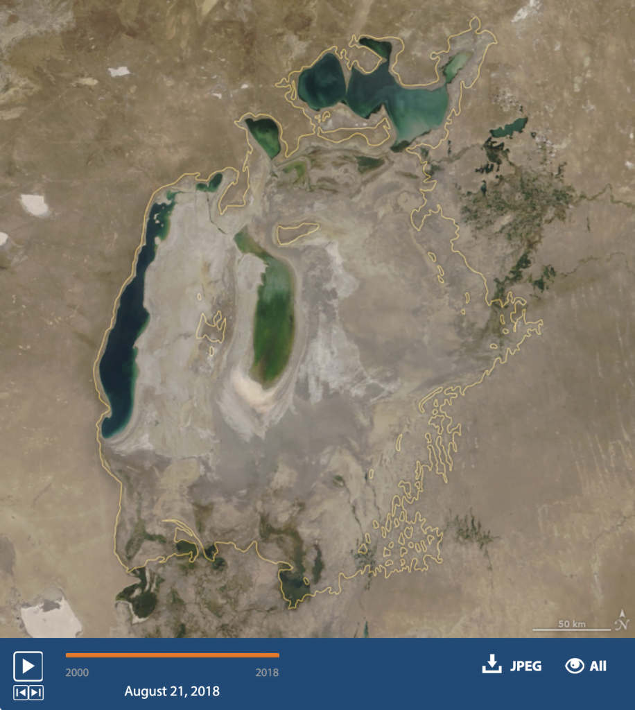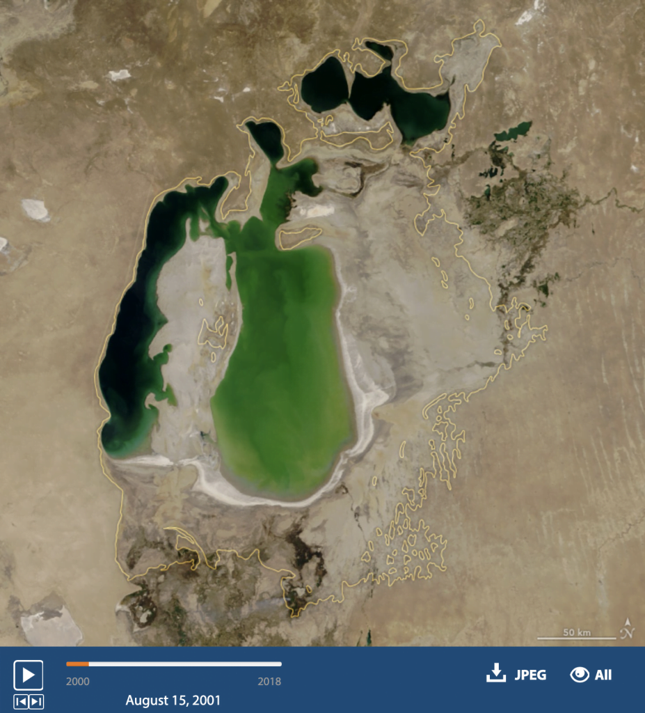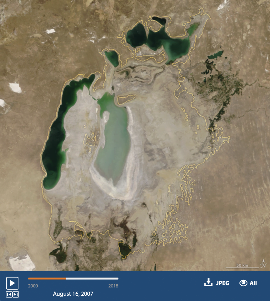 Naquele momento, o Mar de Aral do Norte (ou Mar de Aral Pequeno) já havia se separado do Mar de Aral do Sul (o Grande). Era o início de um colapso visível do espaço.