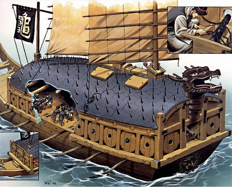 Como ele conseguiu, e por que o Japão não soube derrotá-lo mesmo tendo vencido quase todas as batalhas terrestres travadas no mesmo período, é a pergunta que se impõe. A resposta? Os navios tartaruga considerados por alguns como o primeiro couraçado, artifício parido pela necessidade e gênio asiático séculos antes dos ocidentais o ‘inventarem’.