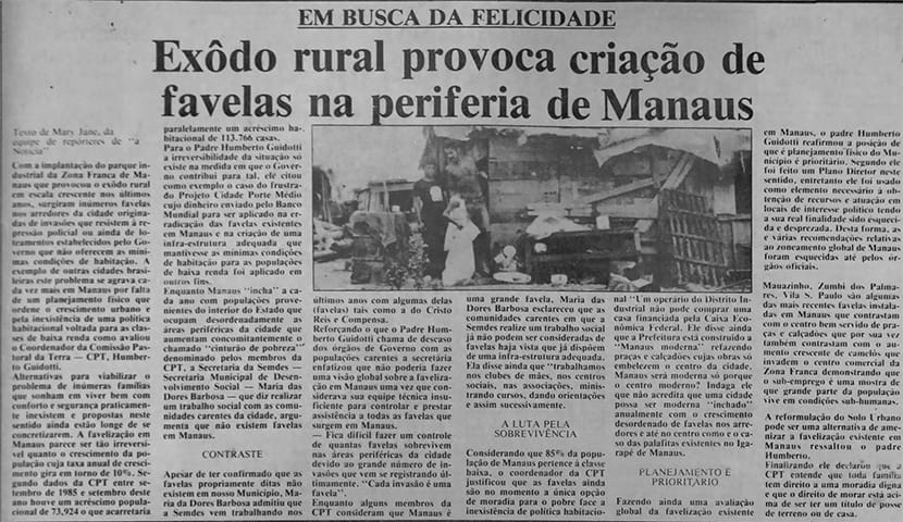 ‘Milhares de desabrigados migraram para a periferia mais distante, forçaram a floresta a recuar e ampliaram os limites da cidade. A ocupação de áreas sem serviços públicos nem saneamento básico originou bairros como Santa Luzia, São Jorge, Cachoeirinha, Aparecida, Mocó, e Compensa, que se tornaria o mais populoso. Manaus ficou cercada por um cinturão de pobreza’.