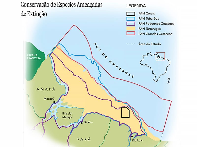 1 – Corredores Ecológicos: Áreas para proteger animais ameaçados, como tubarões, cetáceos, tartarugas e corais, com base nos Planos de Ação Nacionais do ICMBio