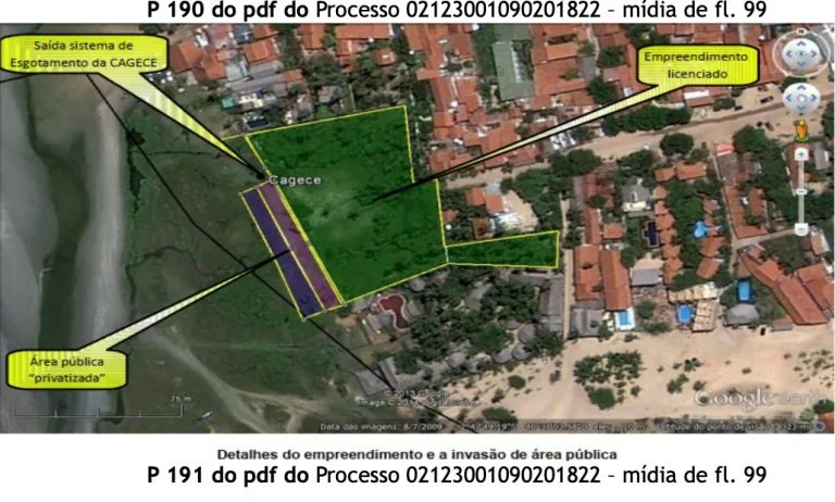Segundo a matéria do Blog, o Instituto Chico Mendes de Conservação da Biodiversidade (ICMBio) disse que a empresa aterrava irregularmente uma grande área de praia, sem licenciamento, avançando sobre a tubulação da CAGECE. Movimentaram 600m³ de areia e pedras sem qualquer autorização.
