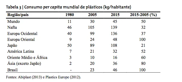 No caso do Brasil os vilões não tem origens nos polímeros, mas nas totais ausências do quê deveriam ser Estados, por exemplo BH tem um prefeito que como candidato falava como macho e que ia abrir as “caixas pretas” disto e daquilo. Eleito é um bosta como qualquer dos antecessores e faz absolutamente NADA; lixo seletivo??? Só mesmo as minhas experiências no Japão há mais de 22 anos atrás. Povo educado???? Basta andar pelas ruas centrais e ver os lixos de humanos onde até fezes humanas se encontra e em boa parte, plásticos. Vejam a tabela 3 onde está listado o consumo “per capita” (kg/habitante) onde cada brasileiro consome 100 kg/ano e não temos onde e como descarta-los pelo menos em BH.