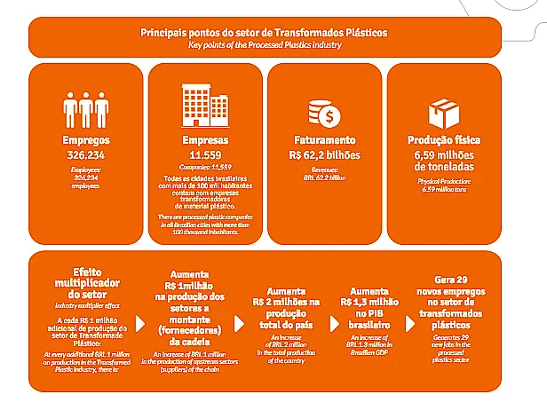 Não há dúvida que é um setor importante da economia, produzindo empregos, gerando renda, mas poluindo tremendamente o meio ambiente. No Brasil a indústria de transformação de plásticos compreende 11.690 empresas que empregaram 348 mil trabalhadores diretos. Em 2012 essas empresas foram responsáveis por vendas que totalizaram R$ 56 bilhões, correspondentes a um consumo aparente de 7,1 milhões de toneladas de transformados plásticos e 6,6 milhões de toneladas de resinas plásticas em 2012 no país.