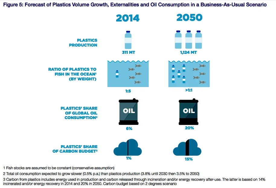 O setor do mercado que utiliza a maior quantidade de produtos plásticos é o de embalagens, ou seja, aquele que fabrica produtos de descarte imediato. Este é o grande problema. Um relatório apresentado no World Economic Forum, 2016, em Davos, Suiça, da Ellen MacArthur Foundation, informa o tamanho do desperdício apenas em plástico usado em embalagens: