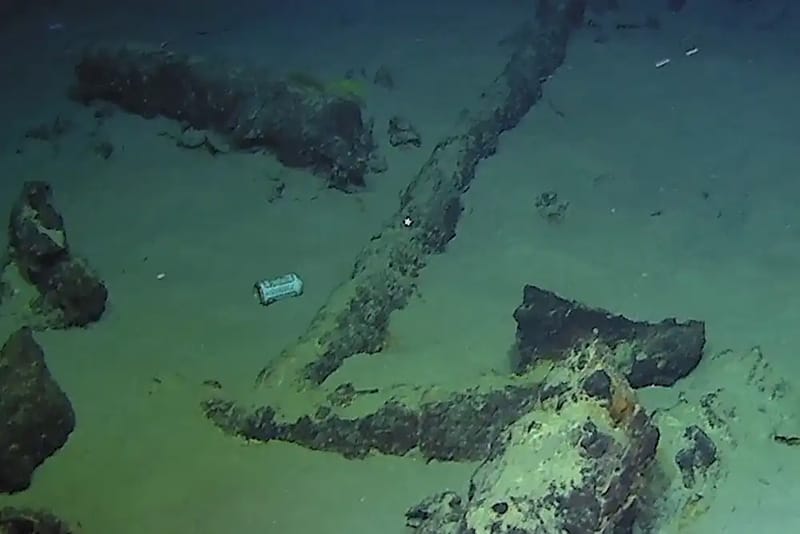 Também mostra alguns dos problemas criados pela poluição marítima moderna, com uma lata de bebidas fotografada entre os destroços a 2,5 km de profundidade.